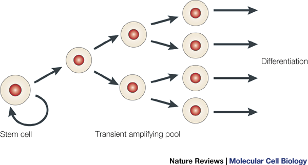 [2] Stem cells have the ability to differentiate into other different cell.Begin with the stem cell with the highest differentiate potential, the totipotent stem cell, it differentiate into multipotent stem cell and then into more specific cell.
